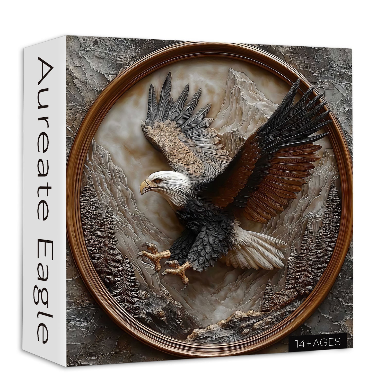 Carved Wood Aesthetic – The artwork appears to be intricately carved from wood, showcasing fine texture details in feathers, trees, and mountains.