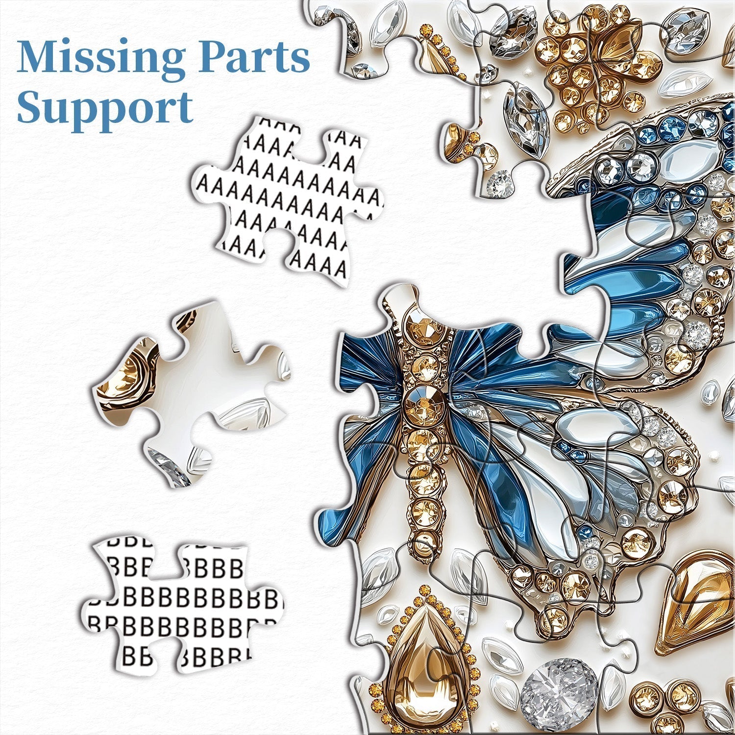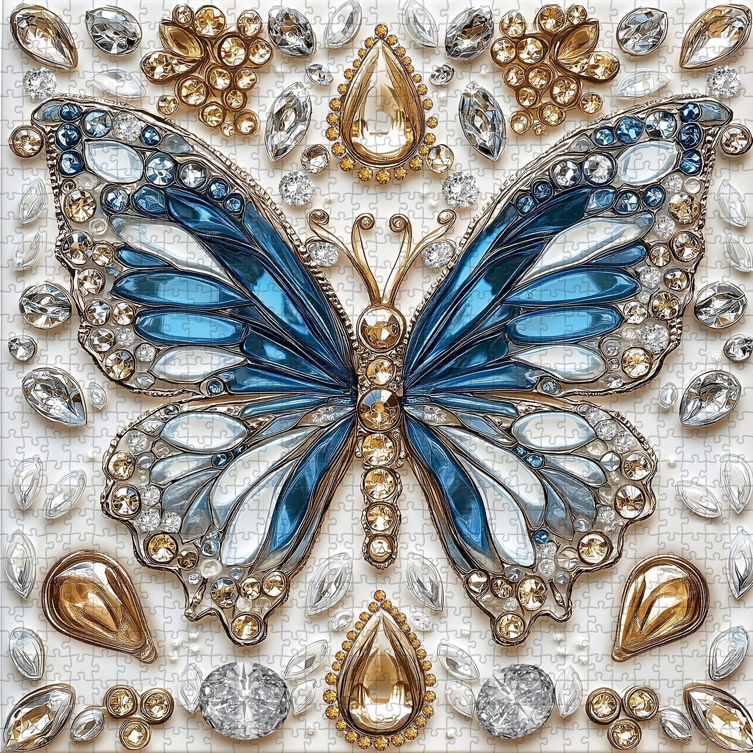 Exquisite Butterfly Design: This puzzle showcases an elegant butterfly adorned with shimmering crystals in shades of blue, gold, and silver. Every detail, from the sparkling wings to the delicate gem accents, brings this radiant butterfly to life, creating a stunning visual centerpiece.